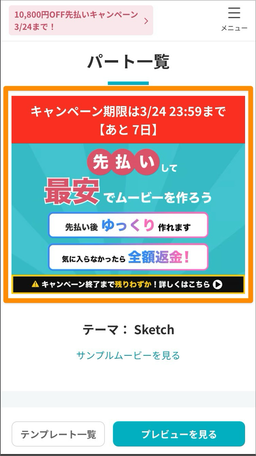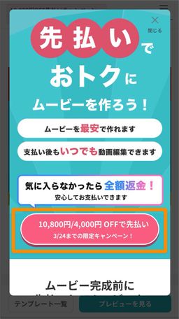 ムービーを完成させる前に「先払い」をしていただくことで、通常価格よりもお得な最安値でムービーをご購入いただけるキャンペーンです。
